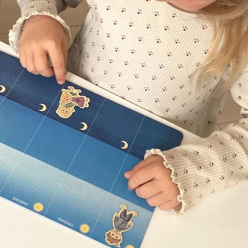 Med 12 medfølgende brikker kan dere enkelt markere hvem barnet skal sove hos.