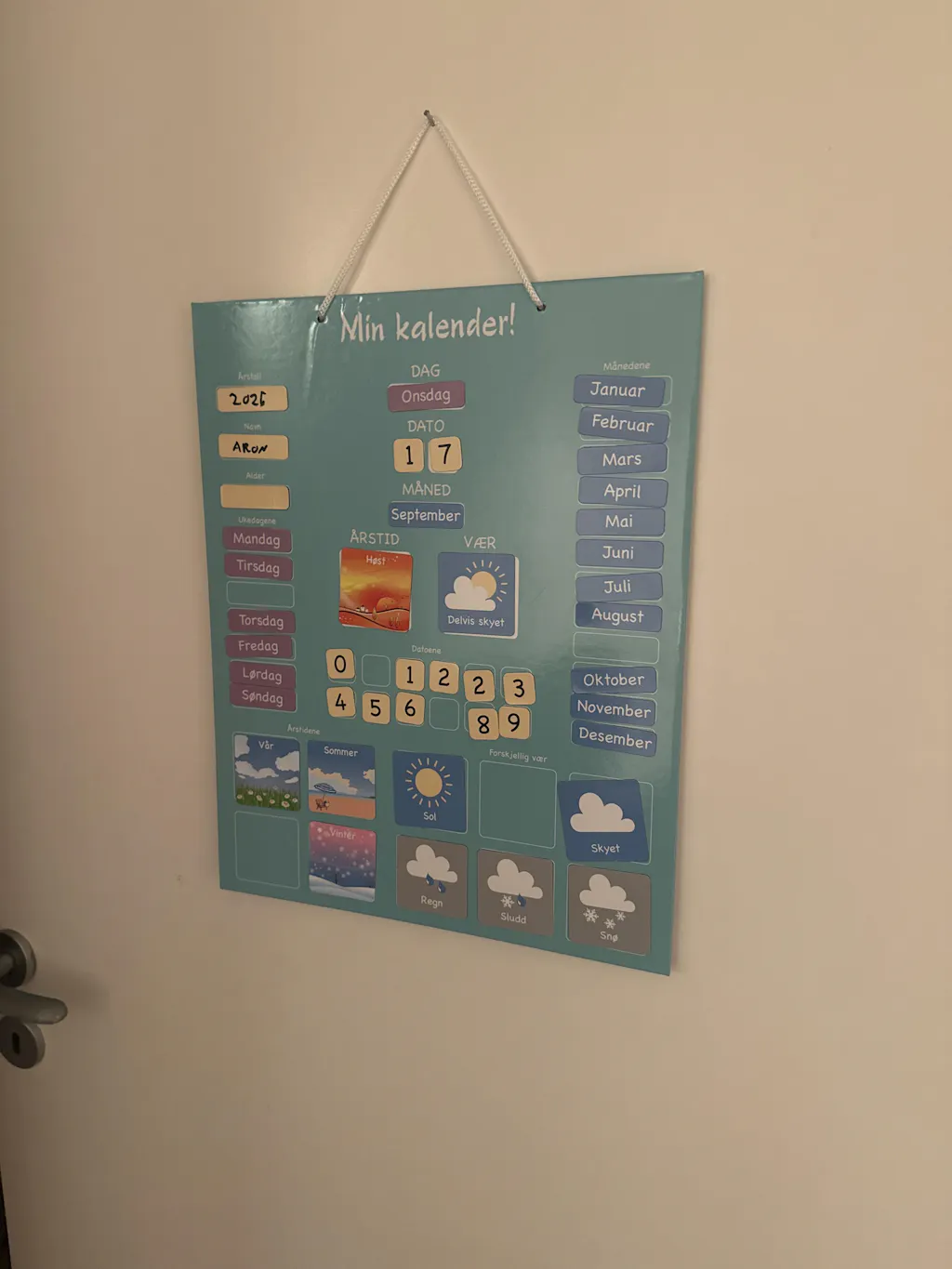 Sitter som et skudd på kjøleskapdøren.Medfølgende tusjer ok og flott at de kan festes på kalenderen. Hadde ønsket meg «svamp» for fjerning av skrift, men våt microklut gjør jobben.