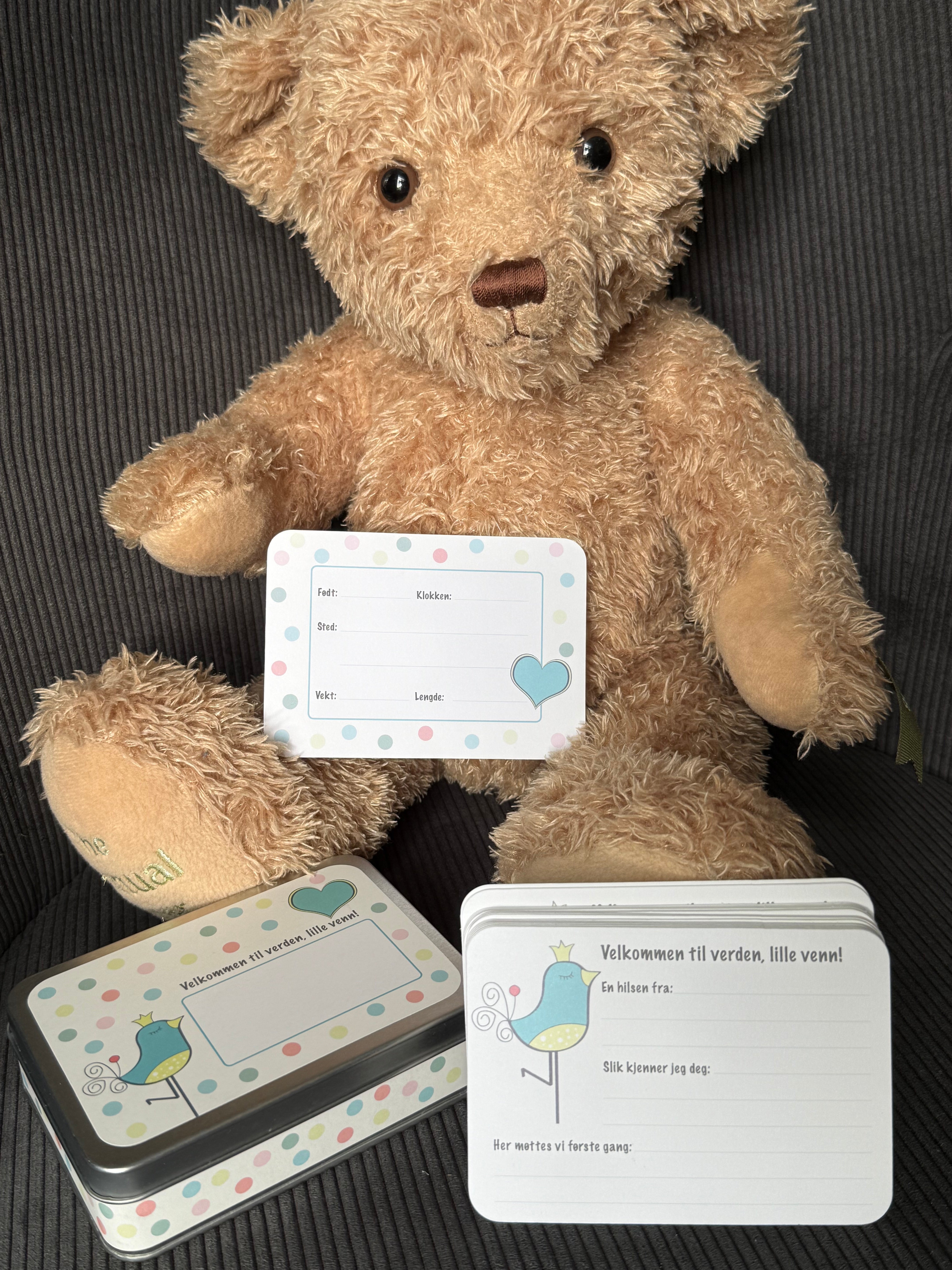 Når venner og familie besøker den nyfødte for første gang, kan de fylle ut et kort hver. Kortene har følgende felt: