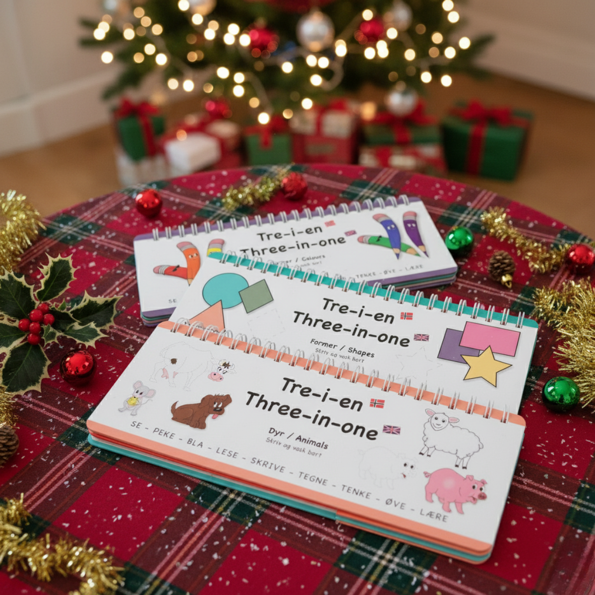Om: 3 bøker - Farger, former og dyr - Engelsk og norsk