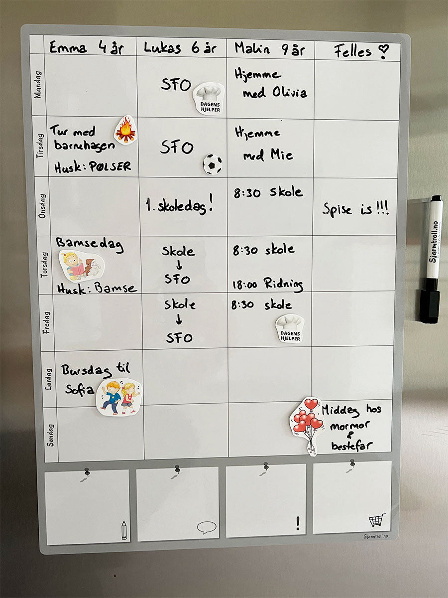 Vi er veldig glad for denne kalenderen. Nå kan hele familen se hva som skal skje til uken og ikke minst vite hva vi skal ha til middag 😊